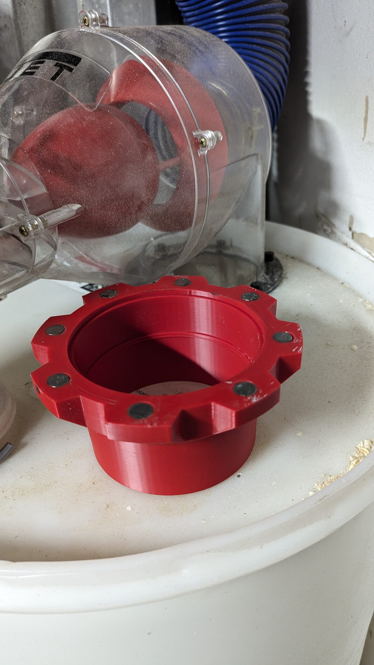 4″ magnetic dust collector with tapered fitting designed for secure attachment to dust collection systems. Features strong magnetic connection and swivel handle for easy maneuverability.