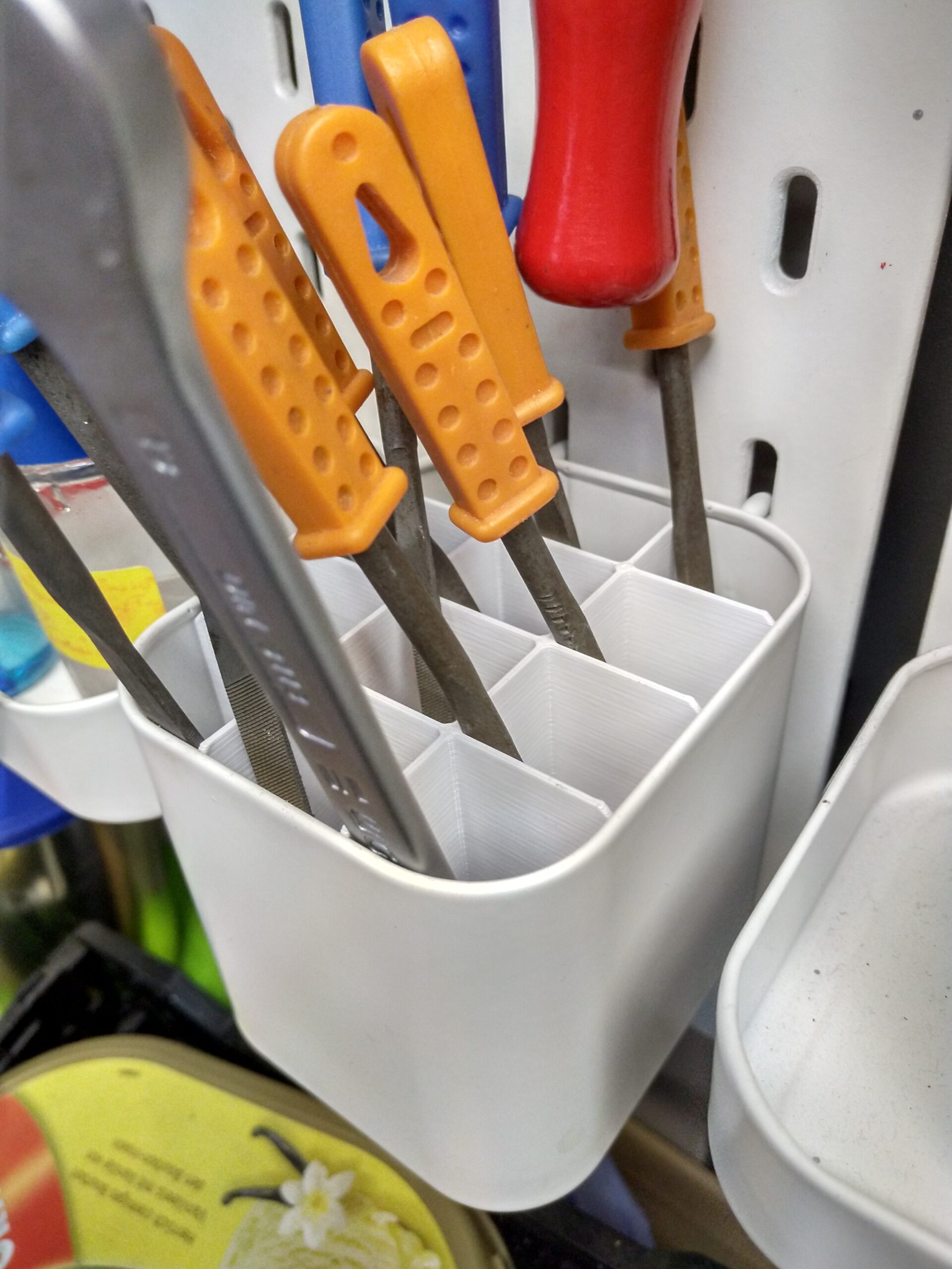 This organizer is designed for users who own Ikea Skådis storage boxes and want to maximize their organization potential. Transform a single box into a highly functional storage solution with either 6 or 12 individual compartments. The durable construction ensures long-lasting performance while maintaining the integrity of your storage system. Installation is straightforward—simply press the divider into place and rotate for the 6-compartment version, or gently flex the tabs and secure for the 12-compartment variant. This efficient solution helps keep tools, hardware, and small parts neatly separated and easily accessible. Whether mounted on a wall or stored in a garage, van, or workshop, this organizer provides practical storage that enhances your workspace organization. The design features reinforced sections to prevent warping and maintain structural integrity over time. Perfect for DIY enthusiasts, professionals, and anyone looking to upgrade their existing storage solutions with a practical, easy-to-use component that works seamlessly with standard Ikea Skådis boxes.