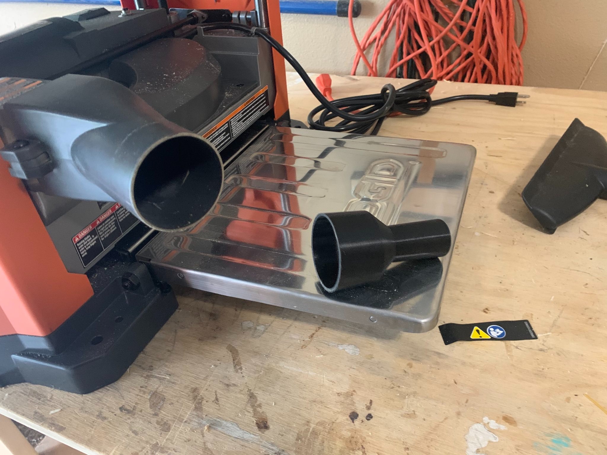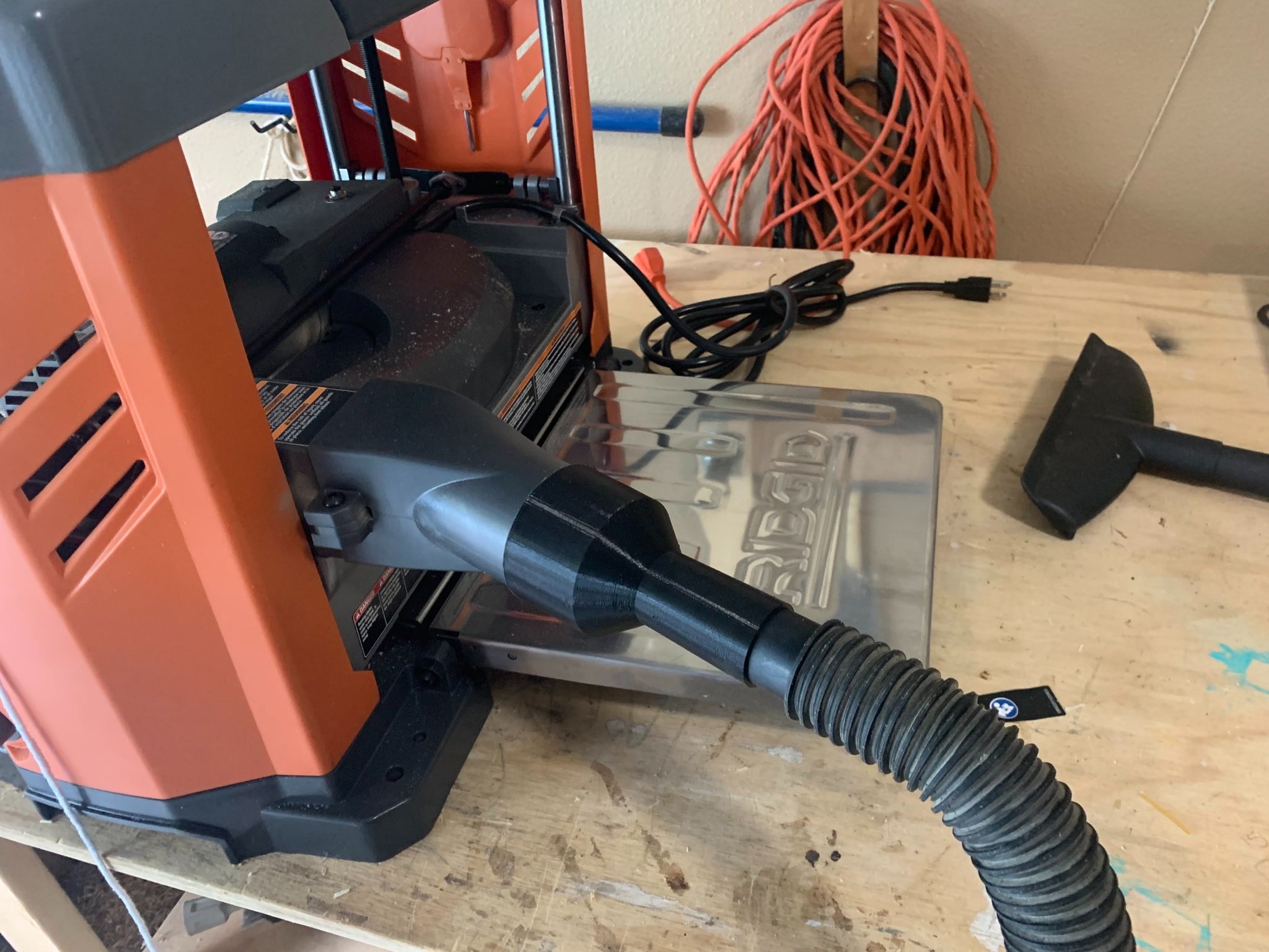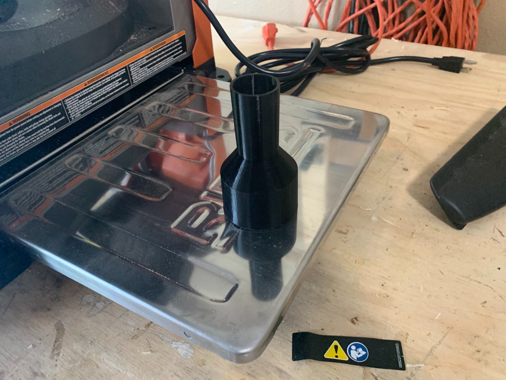 This adapter seamlessly connects your Ridgid 13″ Thickness Planer’s dust collection exhaust to a standard Shop Vac intake hose. Designed specifically for the Ridgid R4331 model, this durable connector helps keep your workshop clean and debris-free by efficiently transferring dust and particles from your planer to your vacuum system. The adapter features a secure fit that maintains optimal airflow, reducing airborne particles that can irritate your respiratory system and create a mess in your workspace. Its robust construction ensures long-lasting performance even during extended use. This simple yet effective accessory eliminates the need for messy manual cleanup and helps maintain a healthier work environment. The 2 3/8in (62mm) planer exhaust connection securely fits your Ridgid 13″ Thickness Planer while the 1 1/8in (30mm) intake matches most standard Shop Vac hoses. Perfect for professionals and DIY enthusiasts who value clean, efficient woodworking operations and want to extend the life of their vacuum equipment by reducing buildup.