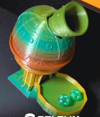 Enhance your tabletop gaming experience with the industrial steampunk Dice Randomizer I tabletop tower, a unique accessory designed for both style and function. This eye-catching dice tower features a spherical, riveted chamber in a gradient of green, teal, and bronze, evoking the look of a fantastical steampunk machine. The angled chute at the top allows you to drop your dice, which then tumble through the chamber and emerge in a hexagonal tray below, ensuring fair and randomized rolls every time.